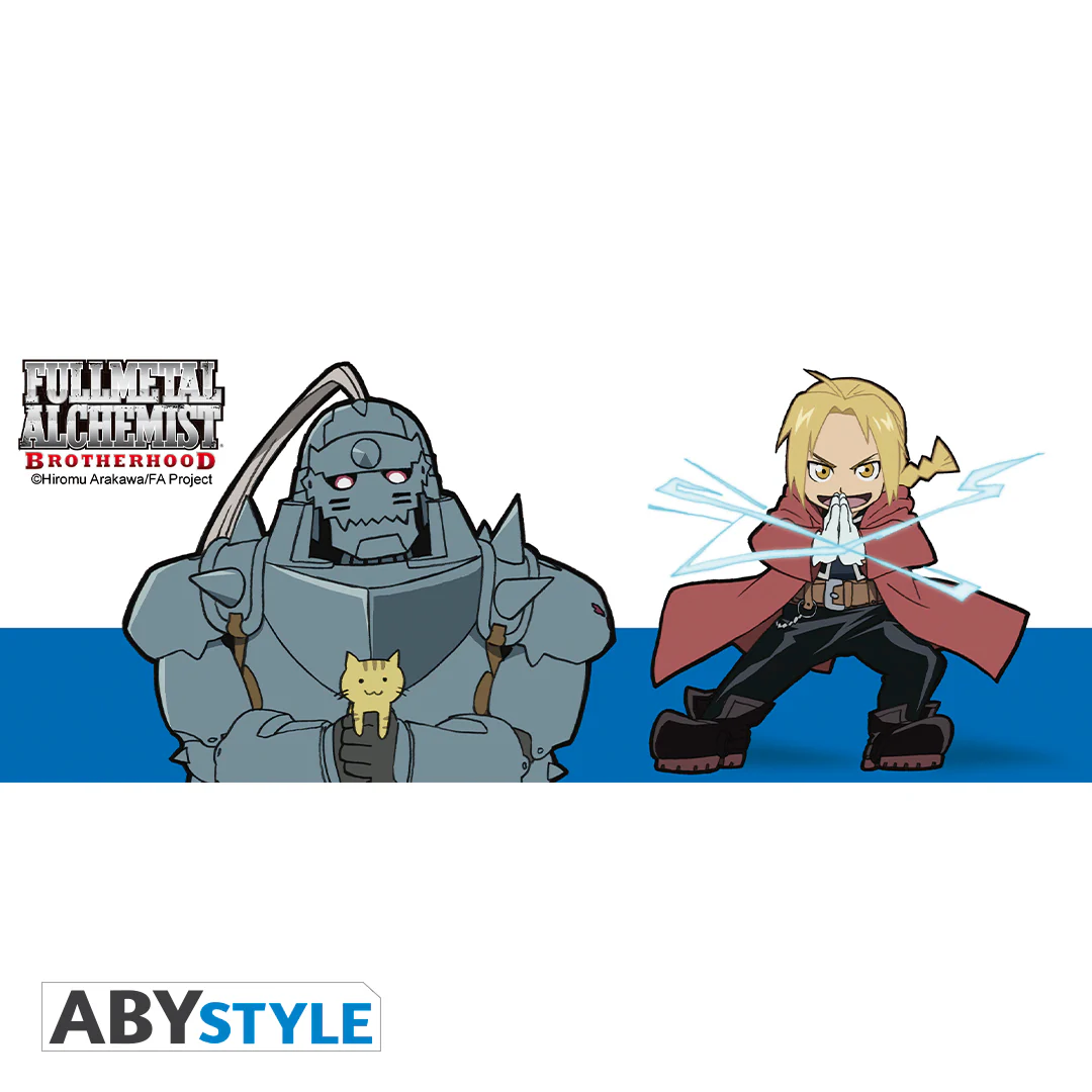 Make your mornings brighter with a cup of coffee and the Elric Brothers! Featuring Edward and Alphonse in chibi form, this officially licensed mug by ABYstyle features Ed about to perform an alchemic feat while Al holds one of his beloved cats. With a pop of blue and an 11 oz capacity, this ceramic mug is a perfect gift for fans of Fullmetal Alchemist: Brotherhood.